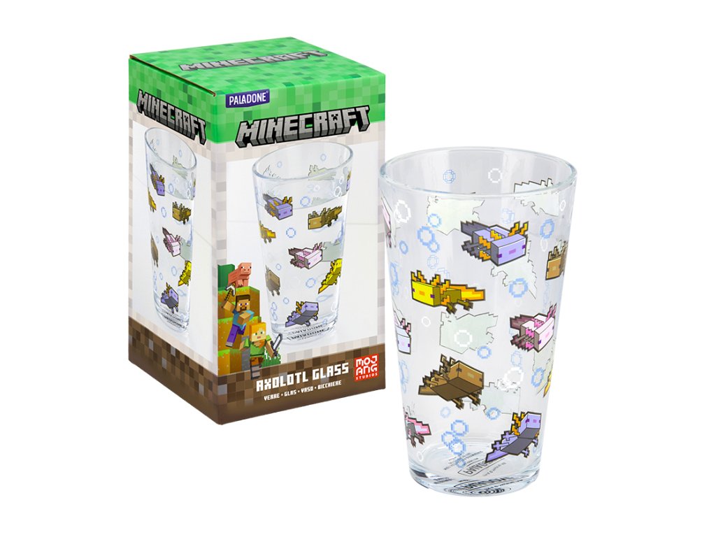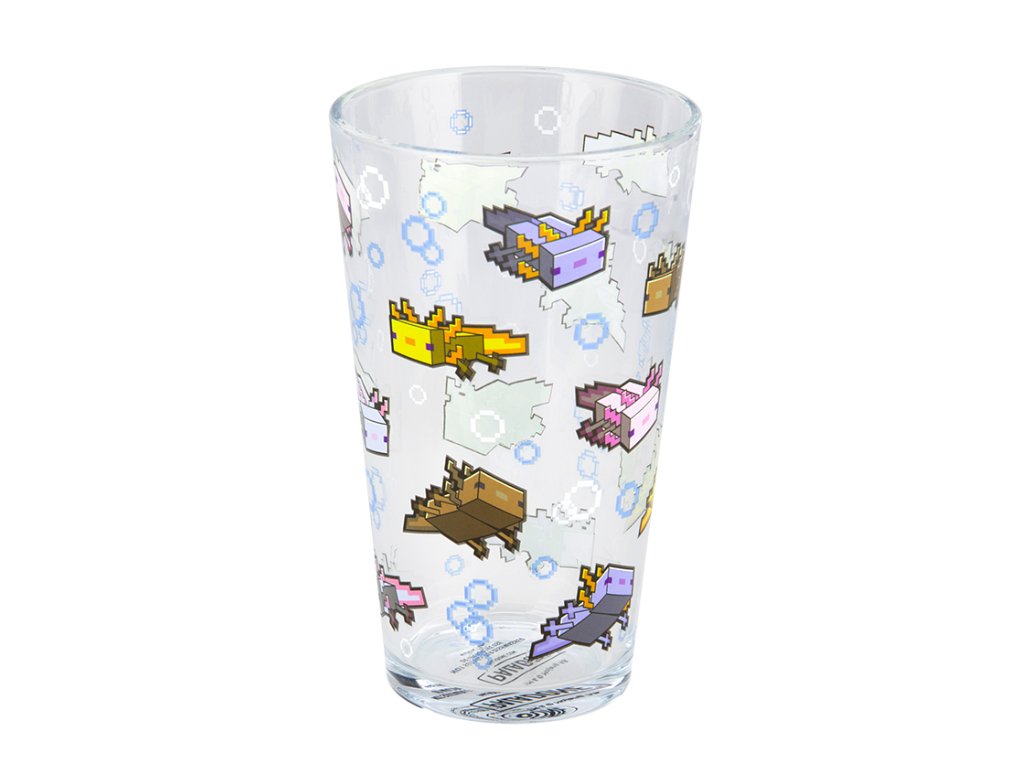 Sklenice s motivy Axolotla z populární hry Minecraft.